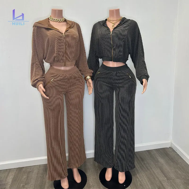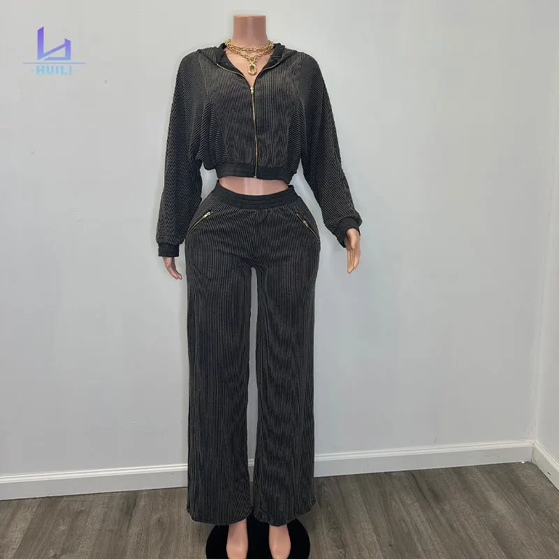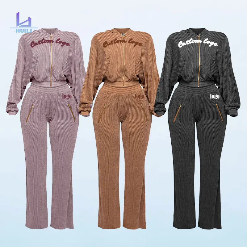 OEM Zip Hooded Crop Top Baggy Pants Set Huili Manufacturer's Women's Loungewear Ribbed Loose Fit Short Skinny Two-Piece Pajamas
